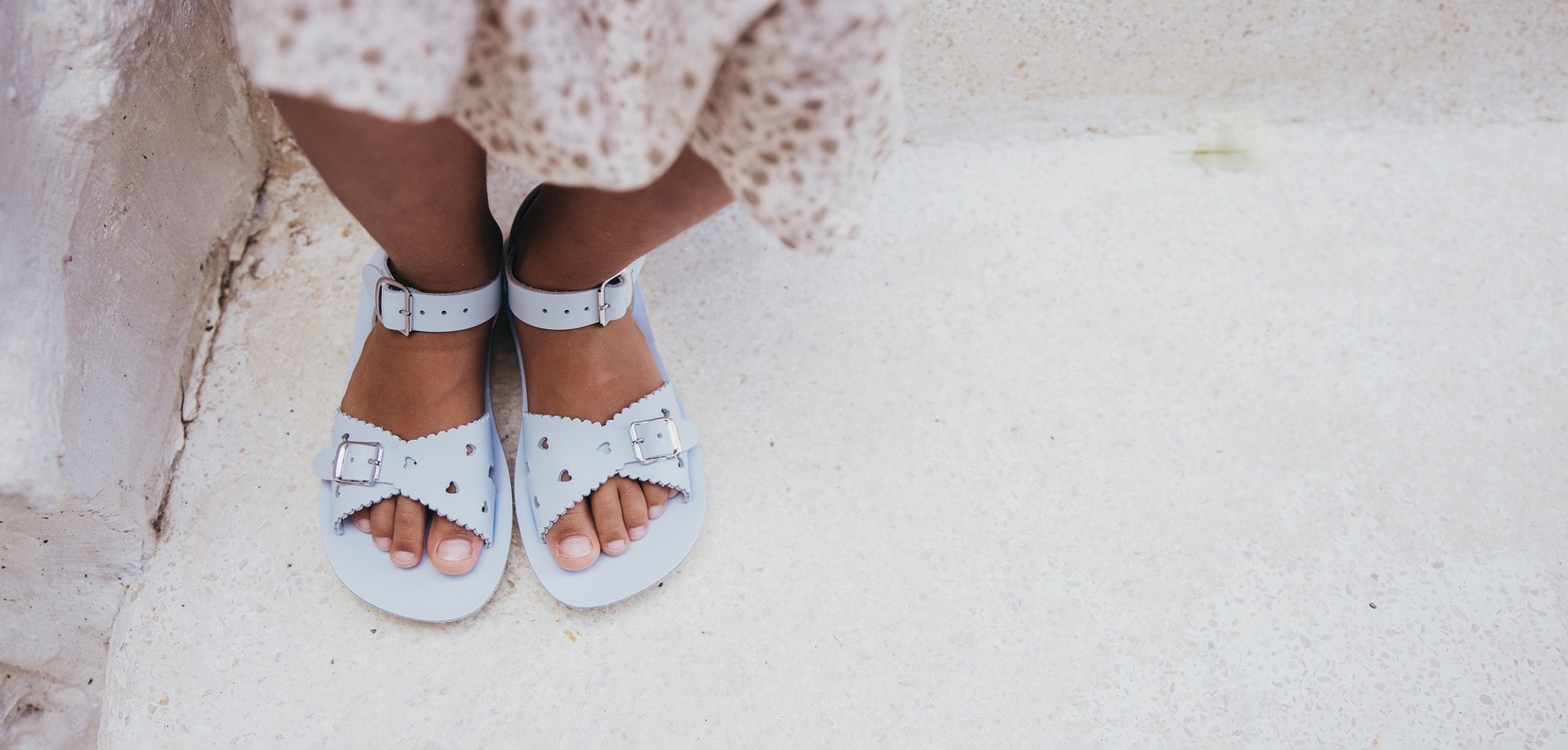 Our popular Sweetheart style in our best-selling colour Tan is a super cute kids sandal, just like it sounds! With heart shaped cut-outs and pretty, scalloped edges featuring fully adjustable double buckles on the toe and ankle strap, this sandal can be worn in water and like all Sun-San sandals comes on a comfortable spongy urethane sole.